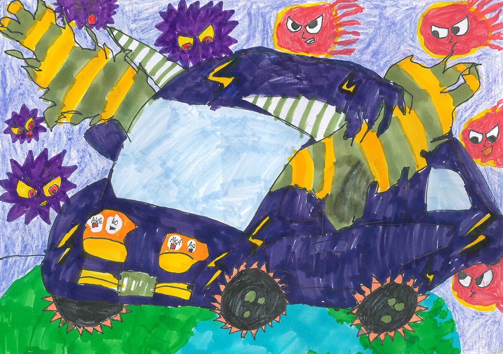 コメント:地球のために戦う車があったら良いなと思い、デザインしました。ウイルスや暑さ(地球温暖化)から、地球を守れる強くて格好良い車です!