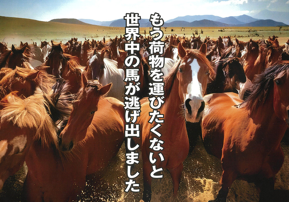 コメント:クルマが無い世界で荷物を運ぶのは馬のみ。荷物を運ぶことに疲れた全世界の馬たちが一斉に暴動を起こした。