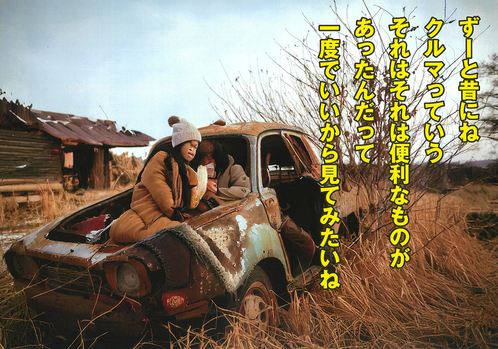 コメント:噂でしか聞いたことが無いクルマという便利なもの。形も用途も何もわからない存在への憧れ。まさか自分たちが家として使っているものがそのクルマとは気づかない。