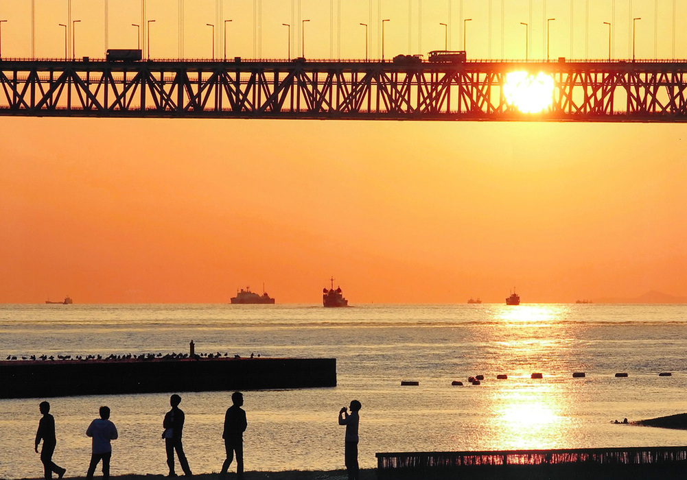 コメント:明石海峡に夕日が沈み、橋を渡る車がシルエットになる。トラックやバス、自家用車、色々な車が往来する。そのシルエットが面白い。