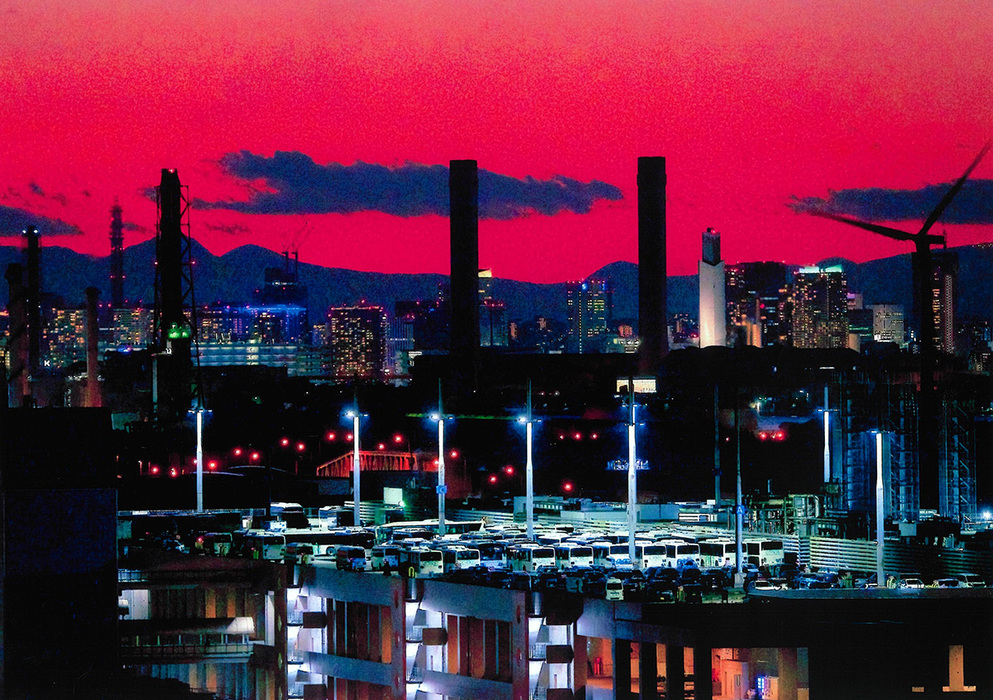 コメント:夕染まる臨海部の物流センター屋上の駐車場に並ぶ大型バス。今日の仕事を無事に終えて安堵している様でした。