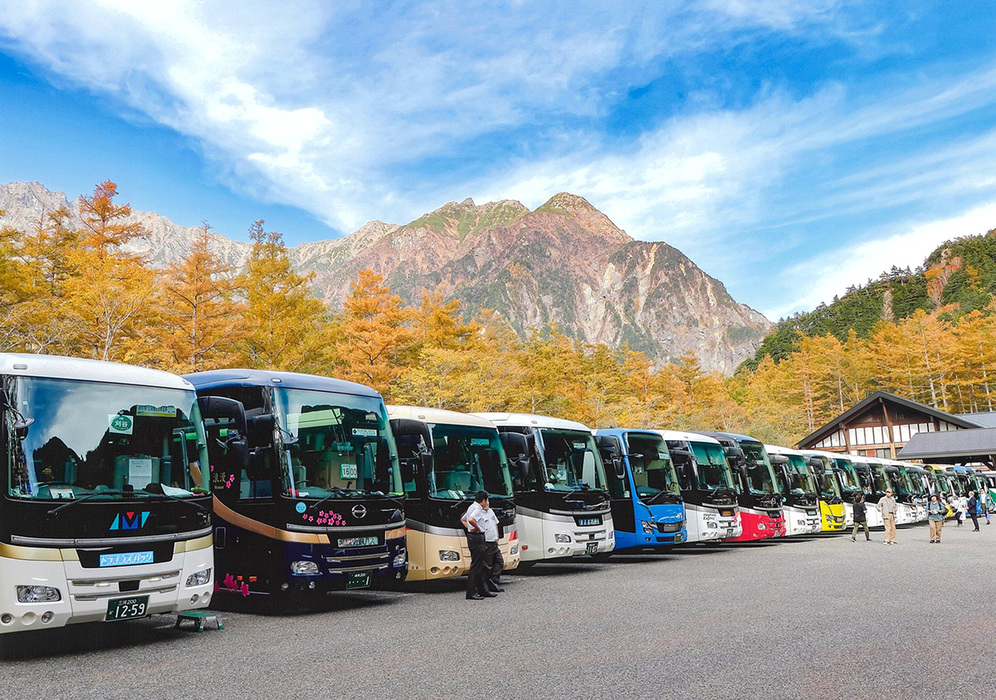 コメント:全車乱れず、お帰りを待つ上高地駐車場の整列姿です
