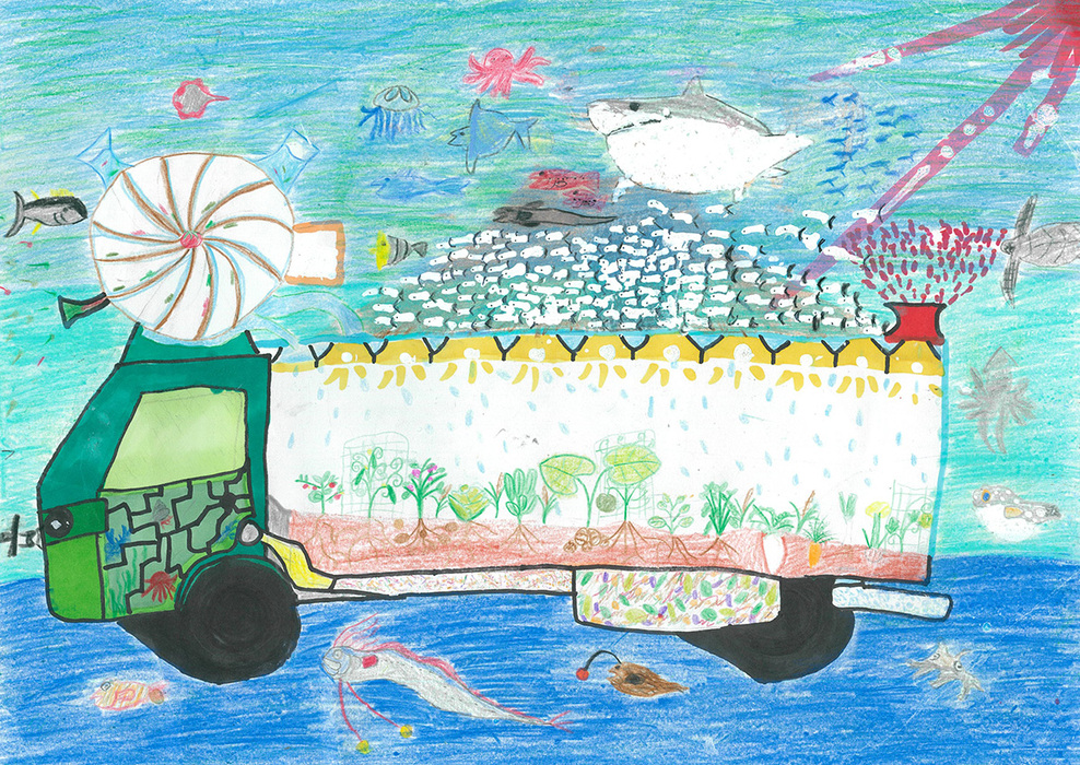 コメント:海に野菜が生えるといいなと思い、緑色の車と自動水塩分け機といっしょに海をぼうけんする車を書きました。