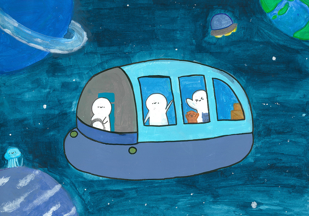 コメント:宇宙をスムーズに運転できるように丸くしました。犬や猫も乗れたらいいなと思って、犬と猫をかきました。