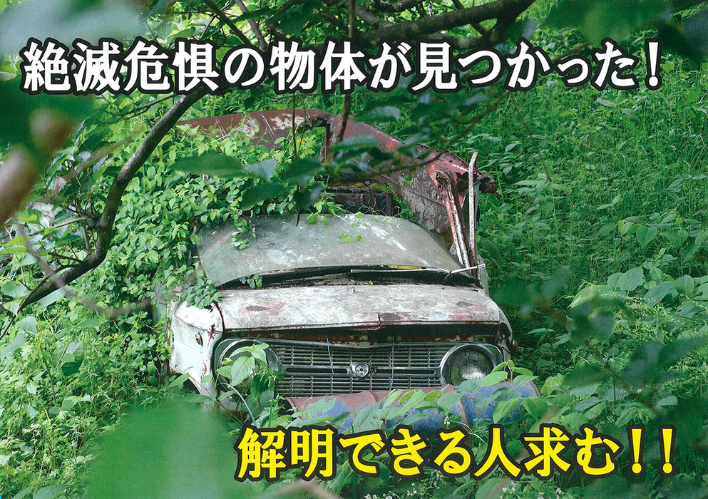 コメント:壊れた車が、発見された!車がない社会で化石のように見つかるという角度で表現してみました。みんな何かわからない。解明できる人はいるのだろうか。
