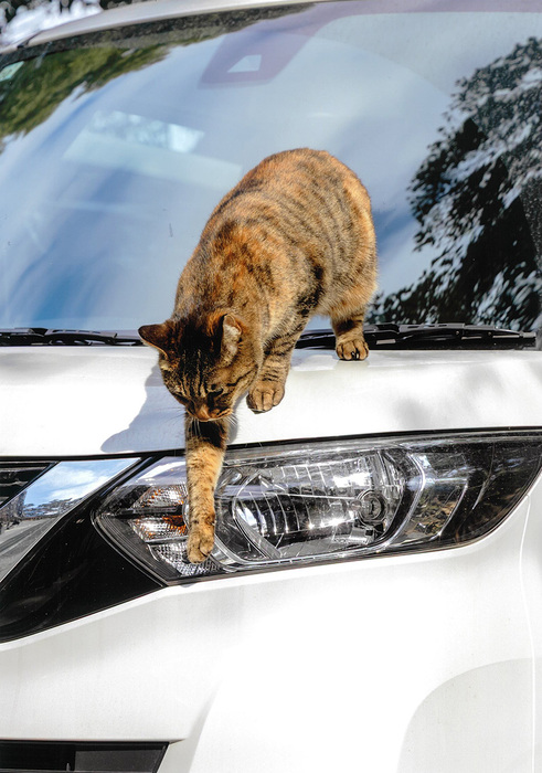 コメント:神社の境内に駐車していた車上で日向ぼっこをしていた猫が降りる様子を撮影。