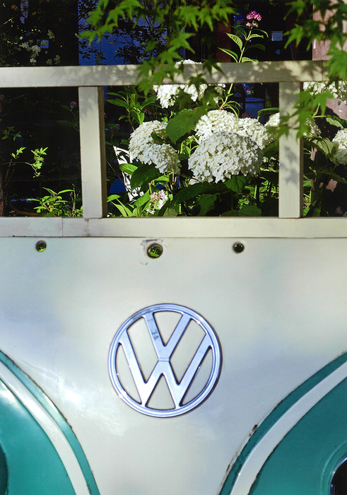 コメント:車のフロント部を利用し、花壇の垣根にリメイク、紫陽花咲く6月、車とライフスタイルの要素を掛け合わせ新しいカーライフ、自動車の新しい価値を発見しました。