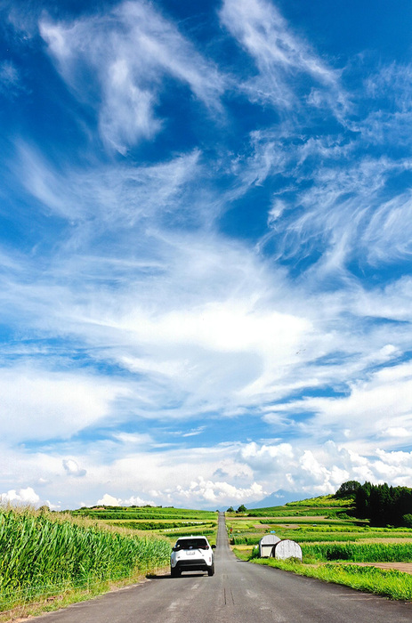 コメント:さわやかな夏雲と高原の一本道を走る一台の車が印象的でした。