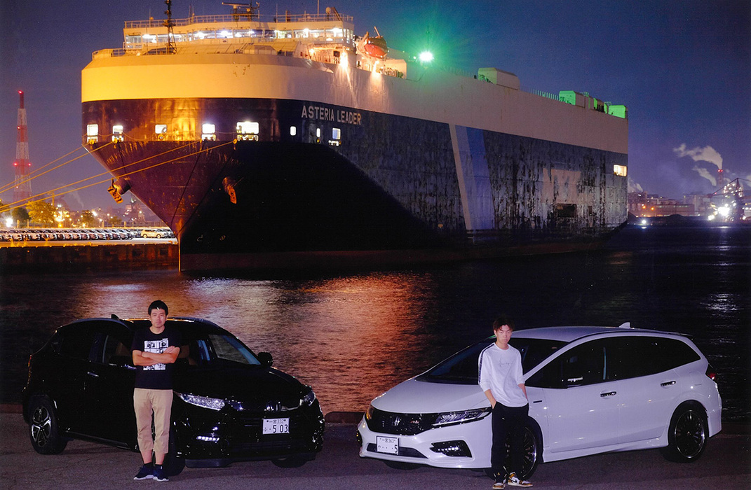 コメント:父とそれぞれの自慢の愛車で、夜のドライブをしていました。偶然にも自動車運搬船が停泊しており、圧倒的スケールの中、車大国日本の車好き親子の記念撮影!