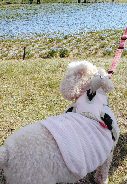 コメント:ネモフィラの花畑を私のペットと行ったときの写真で、花を見ているところが可愛いらしくて良いなと感じました。